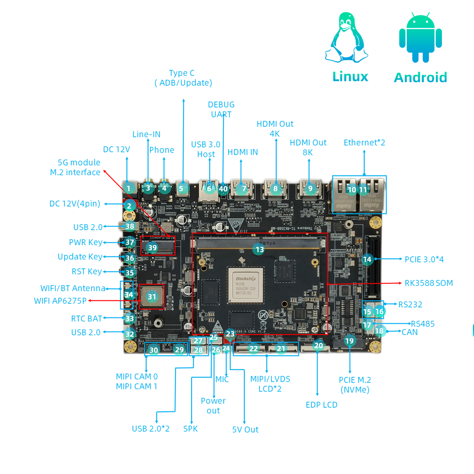 • Kaluwihan RK3588 SBC: Dibandhingake karo produk raspberry PI, papan pangembangan RK3588 nawakake kinerja unggul, antarmuka multimedia, nggawe aplikasi pangolahan multimedia sing kuat, lan aplikasi AI lan industri.